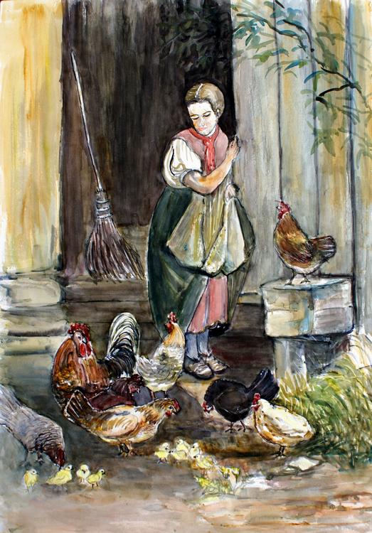 Magd beim Hühner füttern